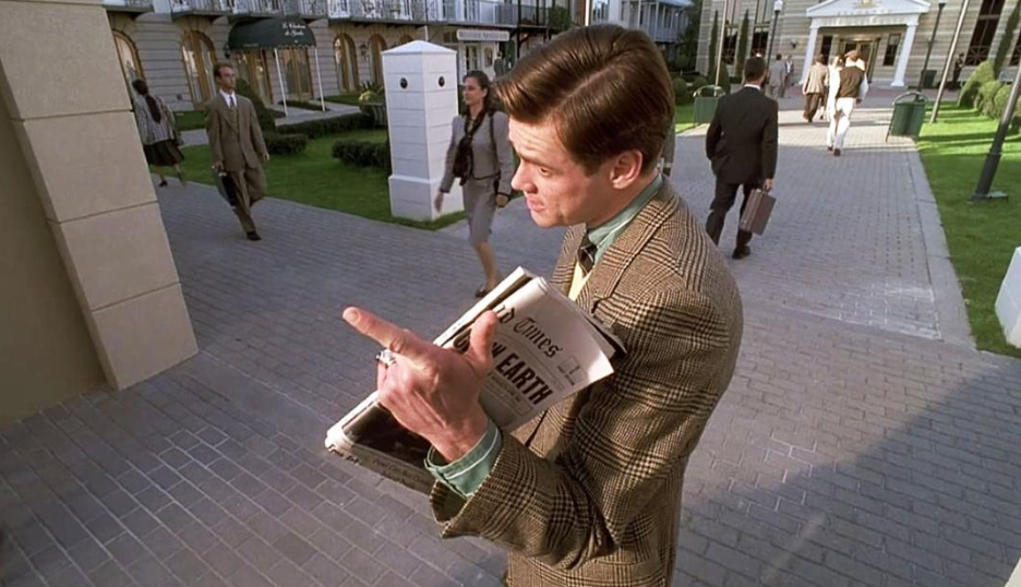 하늘에서 갑자기 조명 장치가 떨어지고, 라디오에서는 이상하게도 자신의 동선과 행동을 설명하는 방송이 흘러나옵니다. 사람들은 부자연스럽게 반복된 행동을 하고, 엘리베이터 안은 마치 세트장처럼 비어 있는 모습까지 드러납니다. 트루먼은 자신이 살고 있는 세상이 어딘가 이상하다는 강한 의심을 품게 됩니다.